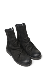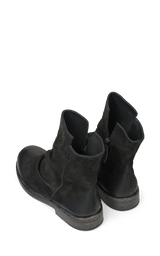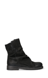 Cool flat suede boot from Ernesto Dolani. The boots have a round toe and are made of black waxed suede - on the toe and heel the suede has received a wax and heat treatment, which both gives the upper a smoother look, but also makes this area more robust. The boots are made with extra leather, so they get more beautiful folds on the terry and the boots get a more unique look. They have a zipper on the inside and a small slit on both sides of the shaft.