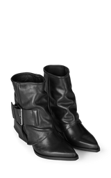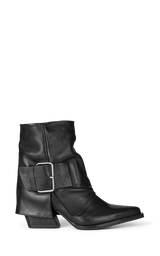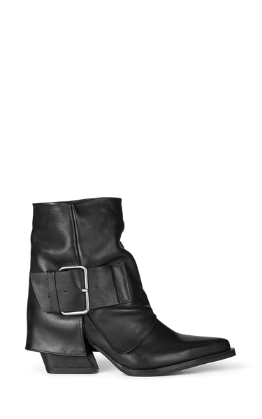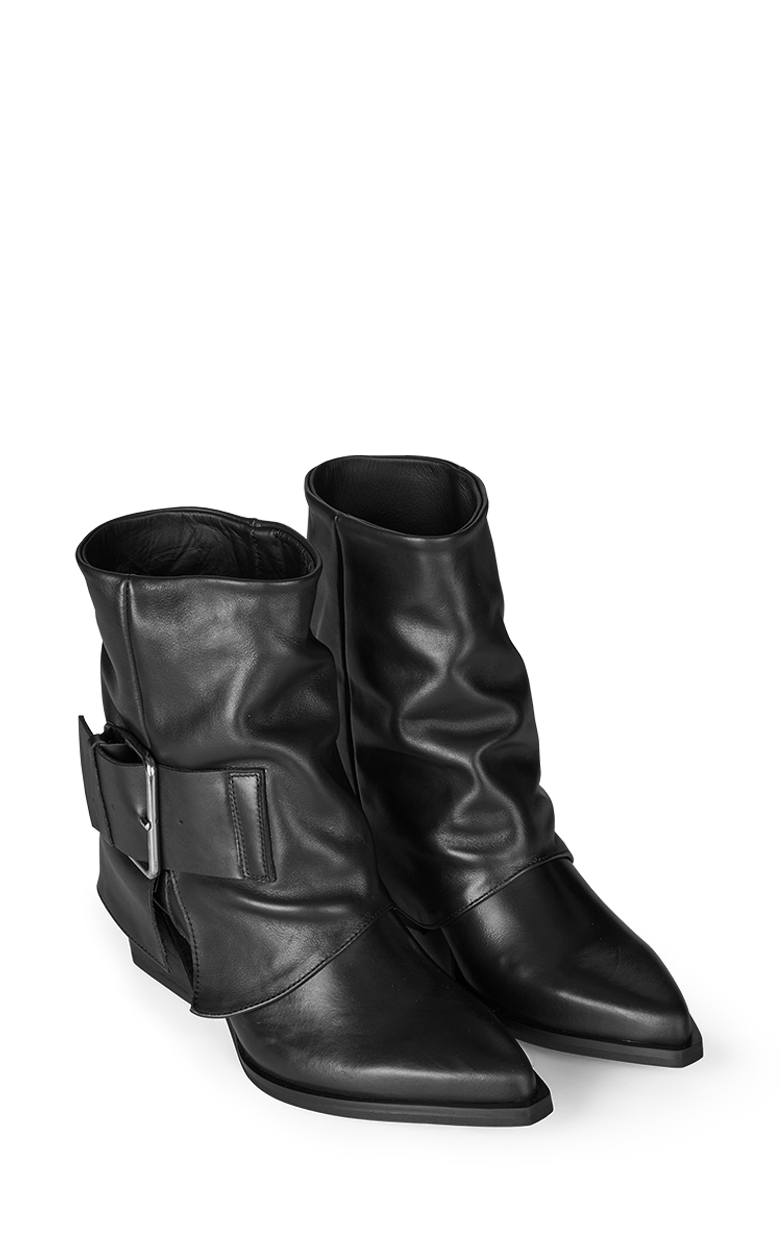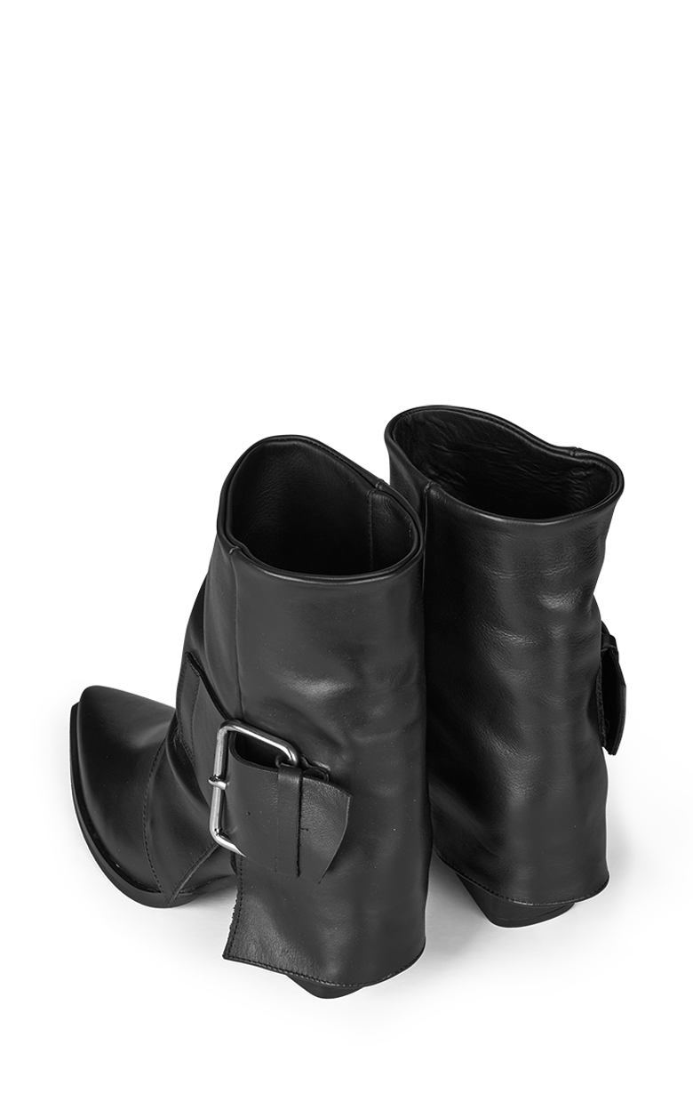 Bend Down Short – Black is a modern boot with a raw attitude and an exclusive look. Made from soft black calfskin and detailed with a wide strap and distinctive buckle, giving an edgy yet sophisticated look. The stable 5 cm block heel makes the boot comfortable for everyday wear, while adding height and style.