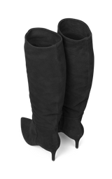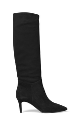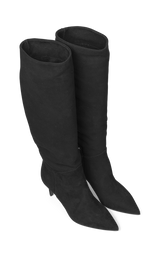 These knee-high boots in soft black suede are a statement piece that adds elegance to any outfit. The pointed toe visually lengthens the legs, while the slim stiletto heel gives a feminine and refined look. The boots have a zipper on the side for easy on and off, and the high shaft length gives a dramatic, yet timeless look.