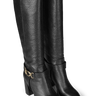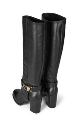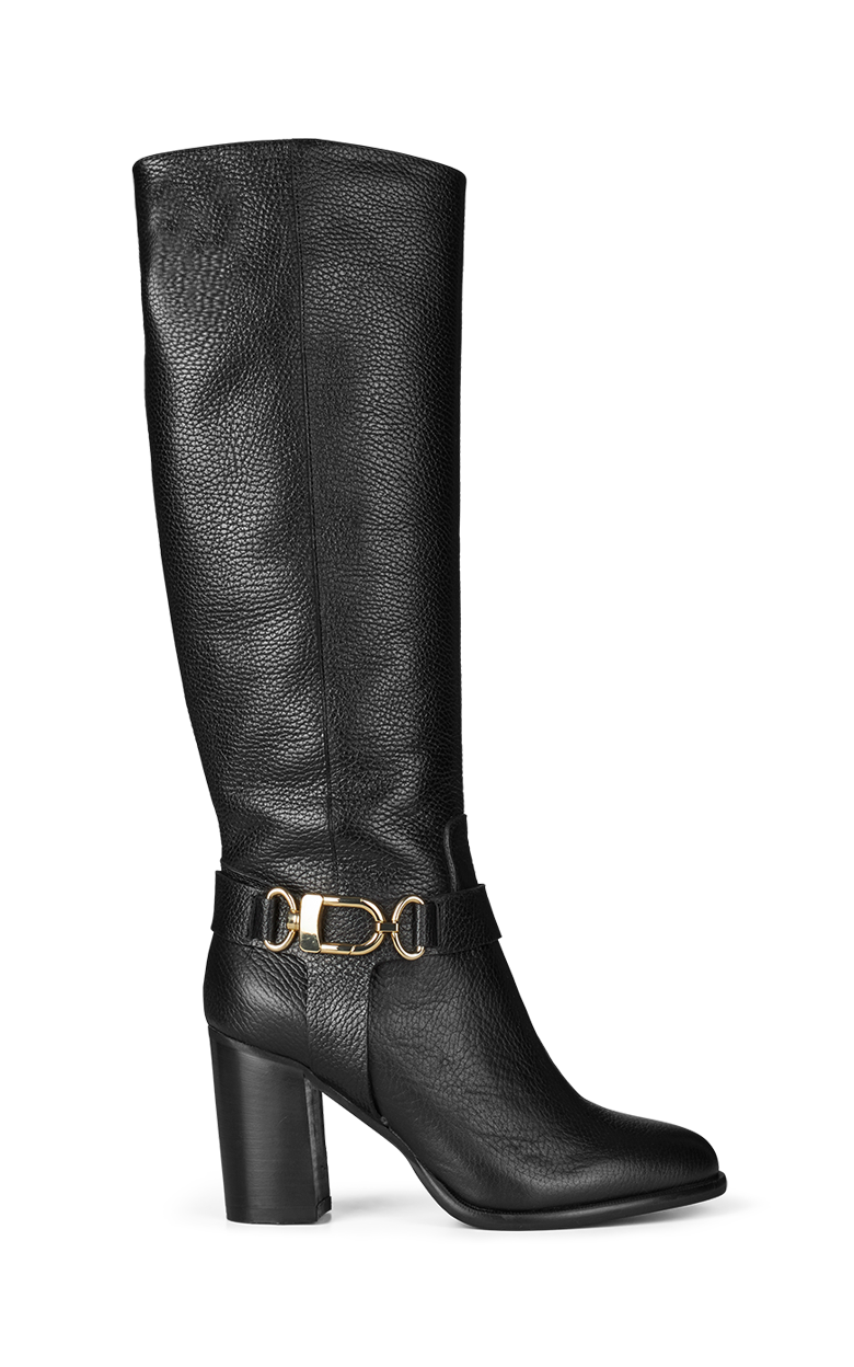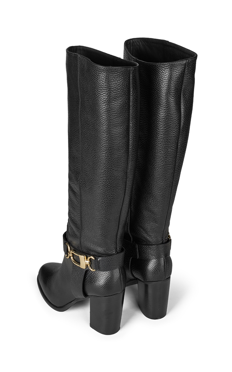 A sophisticated knee-high boot in black embossed calfskin, designed with a distinctive gold buckle that adds an elegant and modern expression. The thick heel provides comfort and stability, while the timeless silhouette makes the boot a favorite season after season. Heel height 7 cm.