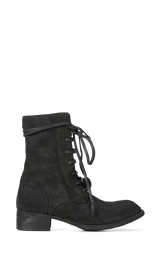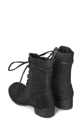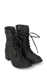 Super cool raw lace-up boots from Fauzian Jeunesse. The boots are made in a black washed suede, have seven lace holes with strong leather laces and a zip on the side.