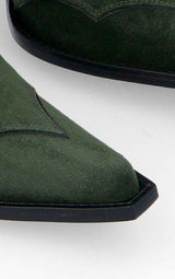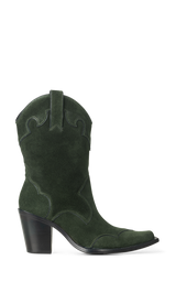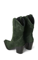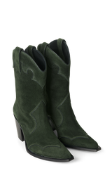 The Andy boot is made in dark army suede, with a western toe and 8 cm slanted heel. The boots have many beautiful details with tone-on-tone stitching - which is part of Free Lance's signature.