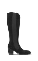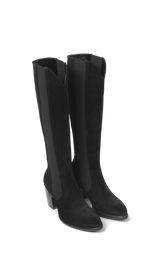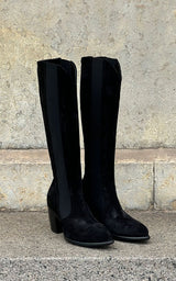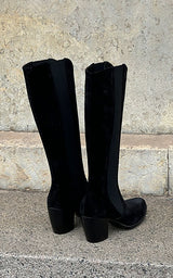 Beautiful long Rocco P. boots in black suede. The boots have long elastic on both sides - so they are easy to put on, can fit several leg sizes and it also adds a cool detail to the boots.