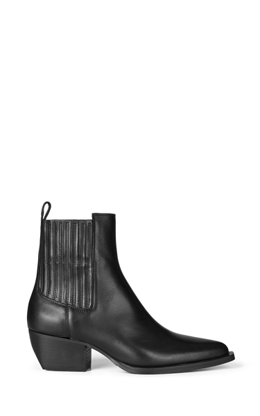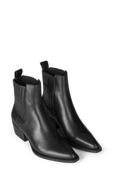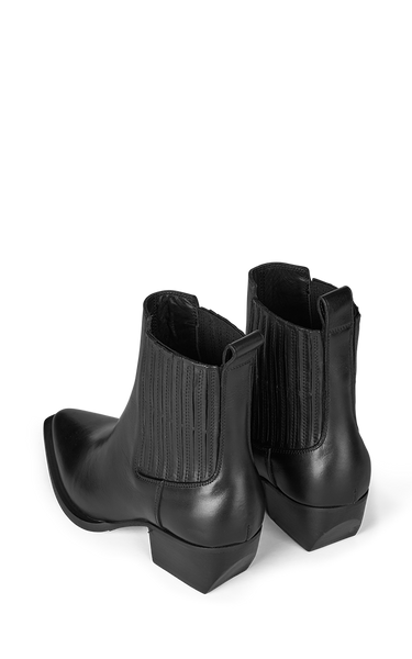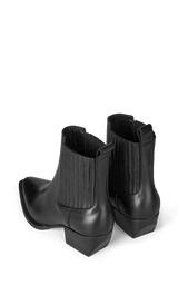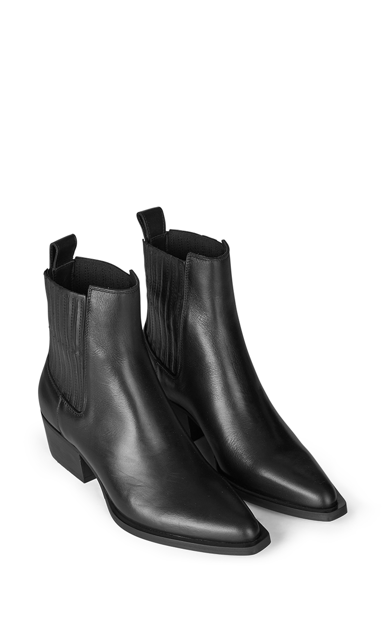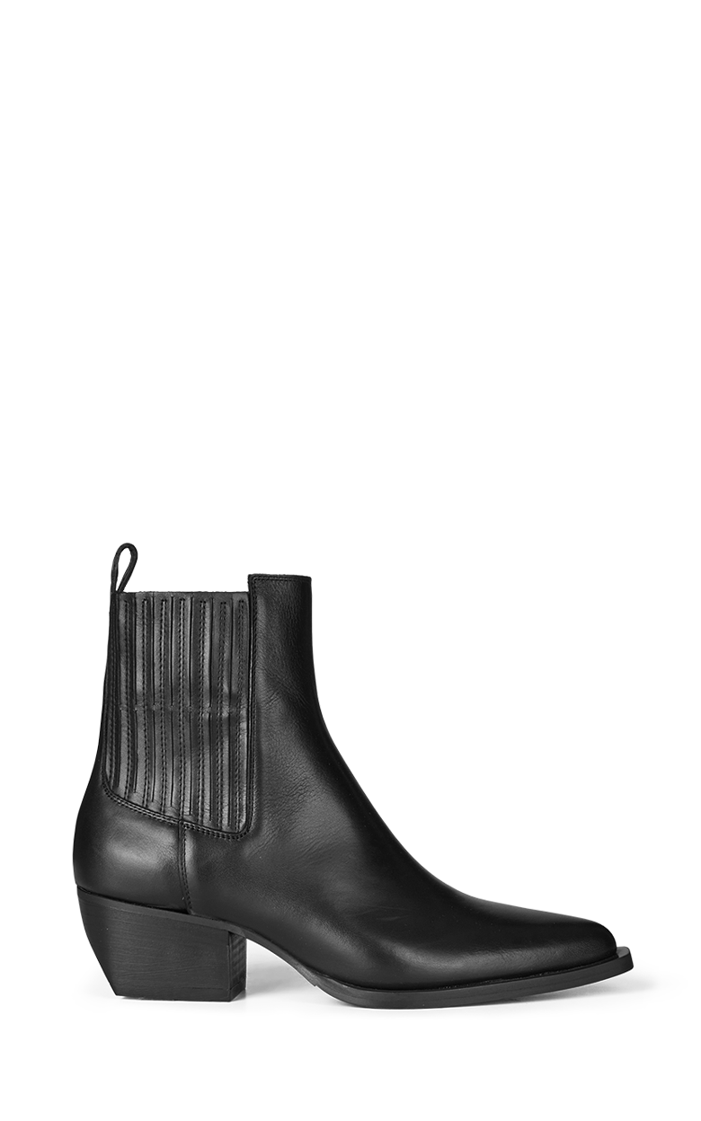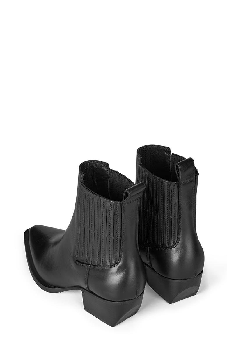 Western Boot – Black is a stylish boot with a modern western-inspired look. Made from soft black calfskin with elastic side panels in embossed leather, which gives an elegant twist to the classic Chelsea silhouette. The low block heel of approx. 4 cm ensures all-day comfort, while the pointed cut gives the boot a sharp and sophisticated look.