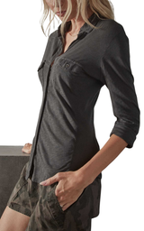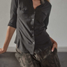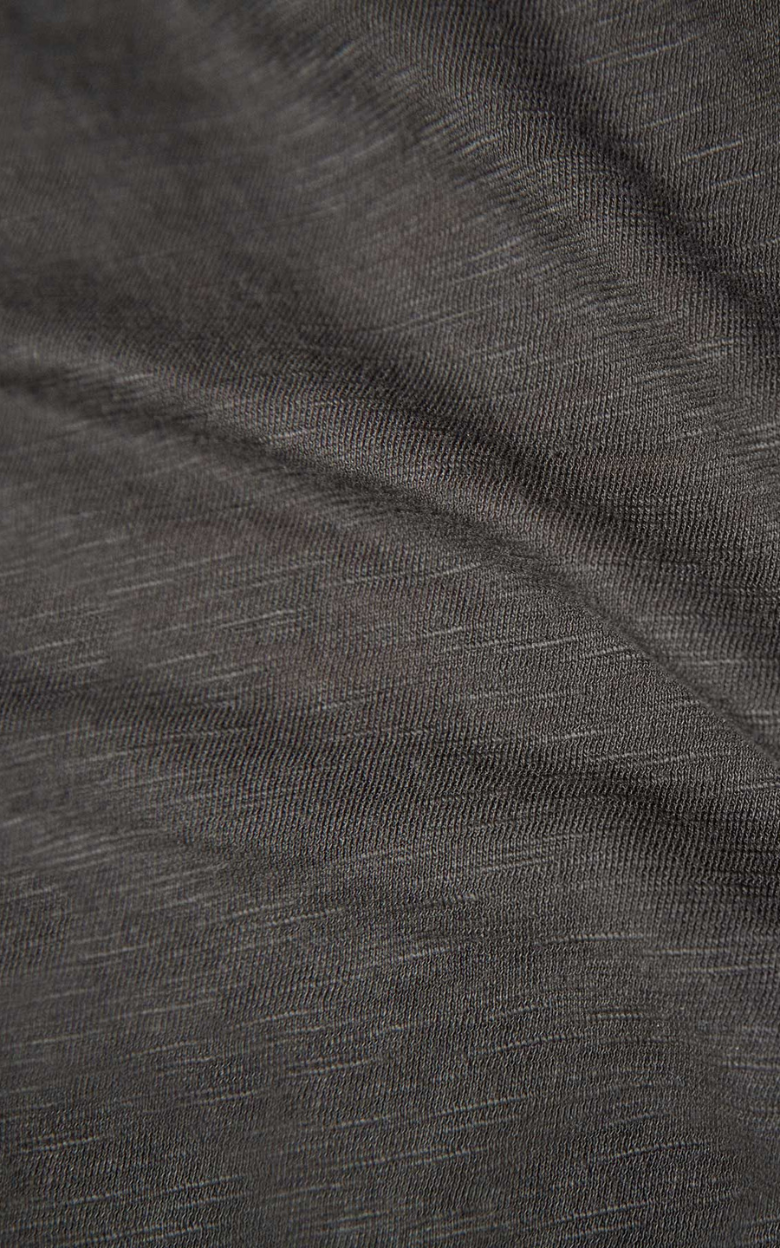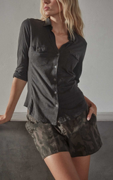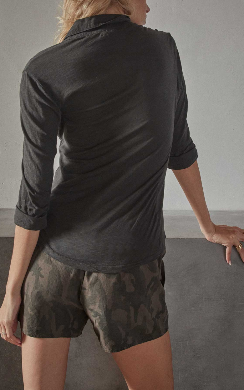 The Contrast Panel Shirt is made from a classic 100% cotton slub. The reverse side of the fabric is used for extra texture, and the shirt has contrast rib panels on the sides and sleeves. The model has a collar, button closure at the front, two chest pockets and a curved hem.