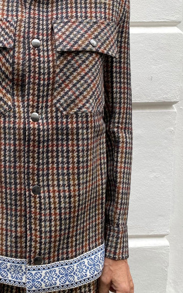 This overshirt from Pierre Louis Mascia combines classic elegance with an artistic twist. The shirt is made from an exclusive wool blend with a refined check pattern in warm earth tones and blue accents. The distinctive blue jacquard embroidered border gives a unique and sophisticated expression - a signature feature for Pierre Louis Mascia, where texture and print meet in an elegant way.
