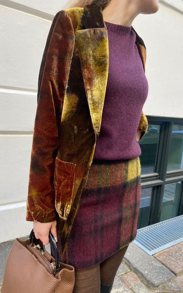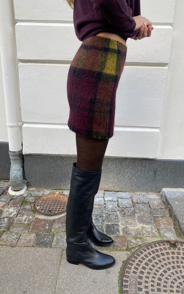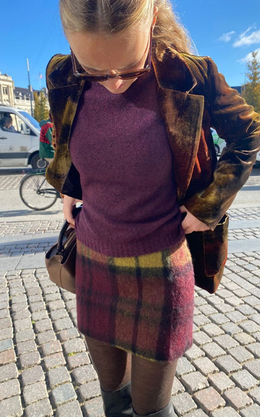 Short skirt in brushed wool blend from Italian Roberto Collina , with an exclusive checkered pattern in warm autumn colors. The soft mohair structure gives a luxurious, fluffy look and makes the skirt both elegant and comfortable to wear.