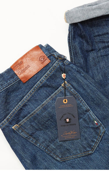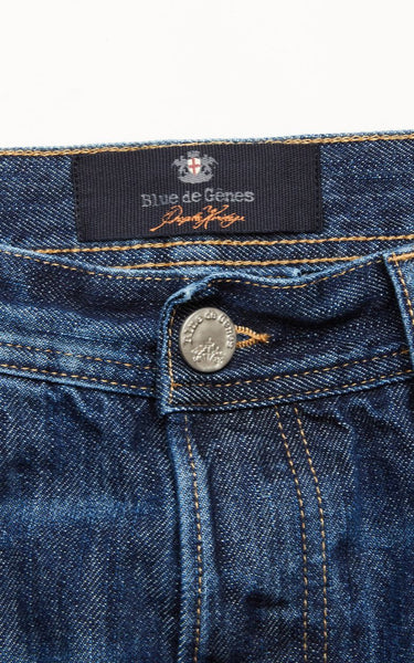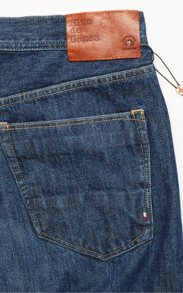 Italian flag embroidery on the right back pocket and a Blue de Genes flag stud on the front right pocket for a touch of authenticity