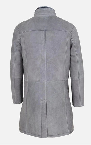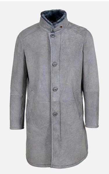Gray coat of lame suede and short-cut rulam. Try this classic shearling jacket for men. Your body will breathe freely through the fur and lining. The handsome collar shows beautifully when it is open, but can also be closed when it gets cold.
