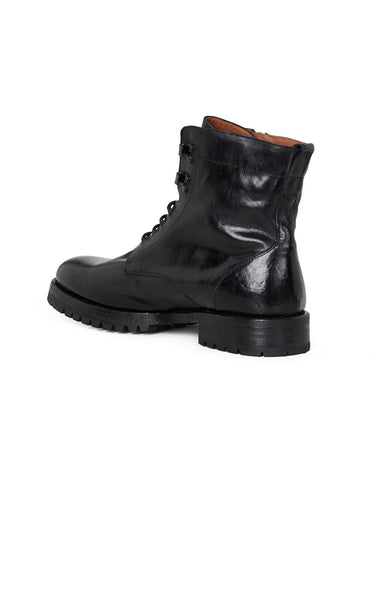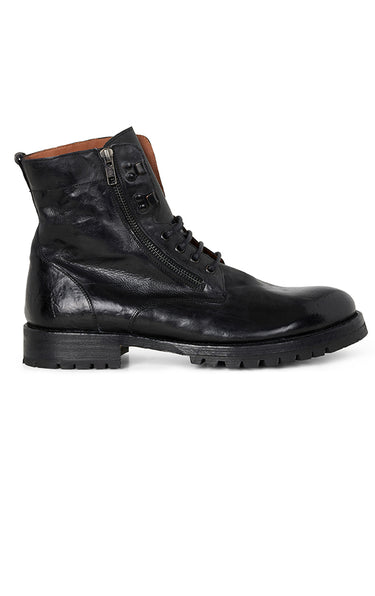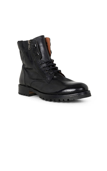 Cool leather boots in a raw washed look from Cordwainer. The black boots are designed with a side zip, laces and a round toe.