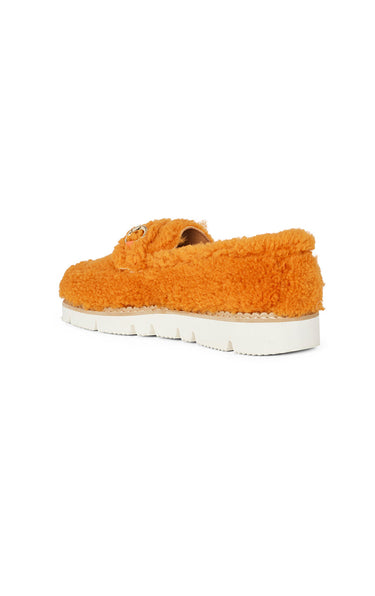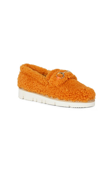 Cool and comfortable, that's the perfect description of this amazing loafer. Made in soft shearling, gold buckle and with white soles. While rulam keeps your feet colored, the beautiful orange color will brighten up any outfit.