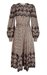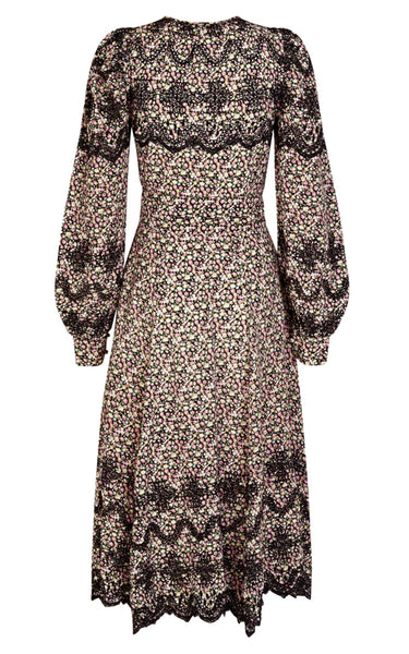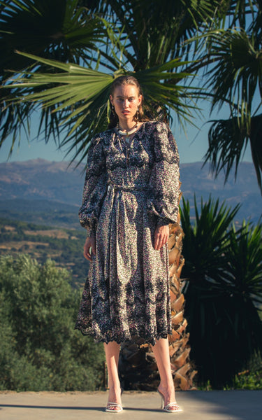 The Venna dress is a maxi dress. 100% viscose in a beautiful floral print with sewn-in handmade lace. It comes with a belt that you can choose if you want to use.