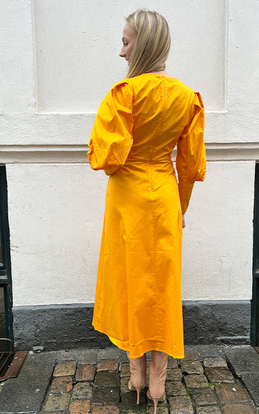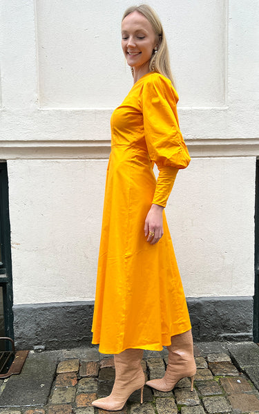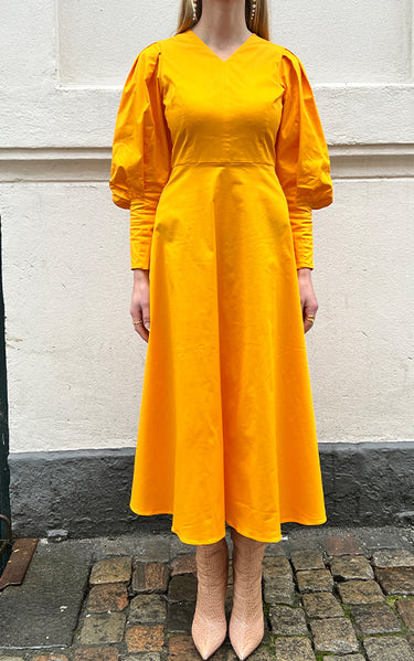 A beautiful silhouette cut to complement all shapes. A voluminous skirt that falls to the calf. The dress has a V-neck and a seam at the waist. The long balloon sleeves are finished with a discreet zipper in the cuff.