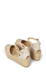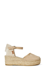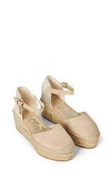 Beautiful wedge espadrilles in sand suede. They have a 6 cm heel and an adjustable ankle strap. Handmade in 100% natural and organic materials such as jute rope, which allows Vidorreta shoes to adapt to the feet.