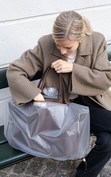 The ReRAIN rain cover protects both your bag and its contents from rain. Our rain cover is specially designed for tote bags, shoppers, work bags, etc. and provides optimal protection against rain, so you can be safe on the go, even if it rains.