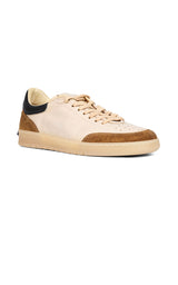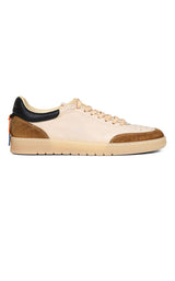Cool sneakers in beige colored leather, with brown suede details, dark blue detail on the heel, small orange detail on the heel and rubber soles.