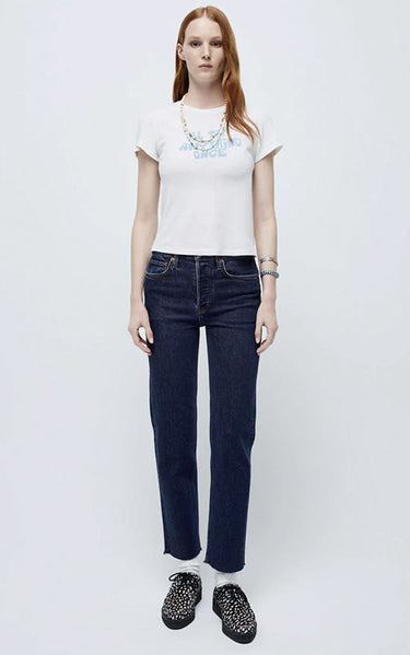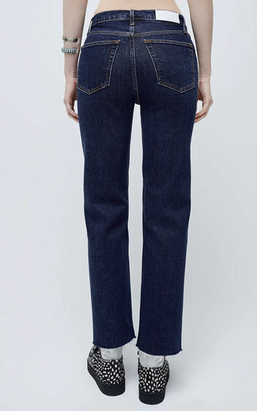 The 70s Stove Pipe in Dark Rinse is Re/Done's take on the classic 70s-inspired straight leg jean with a cropped inseam. Features a light washed indigo reminiscent of deadstock denim in comfort stretch denim, a classic button fly and a cut hem.