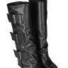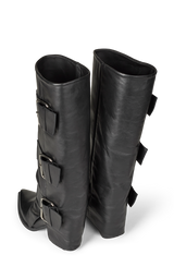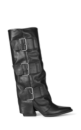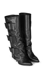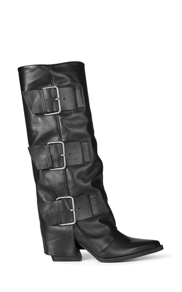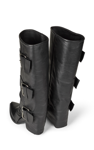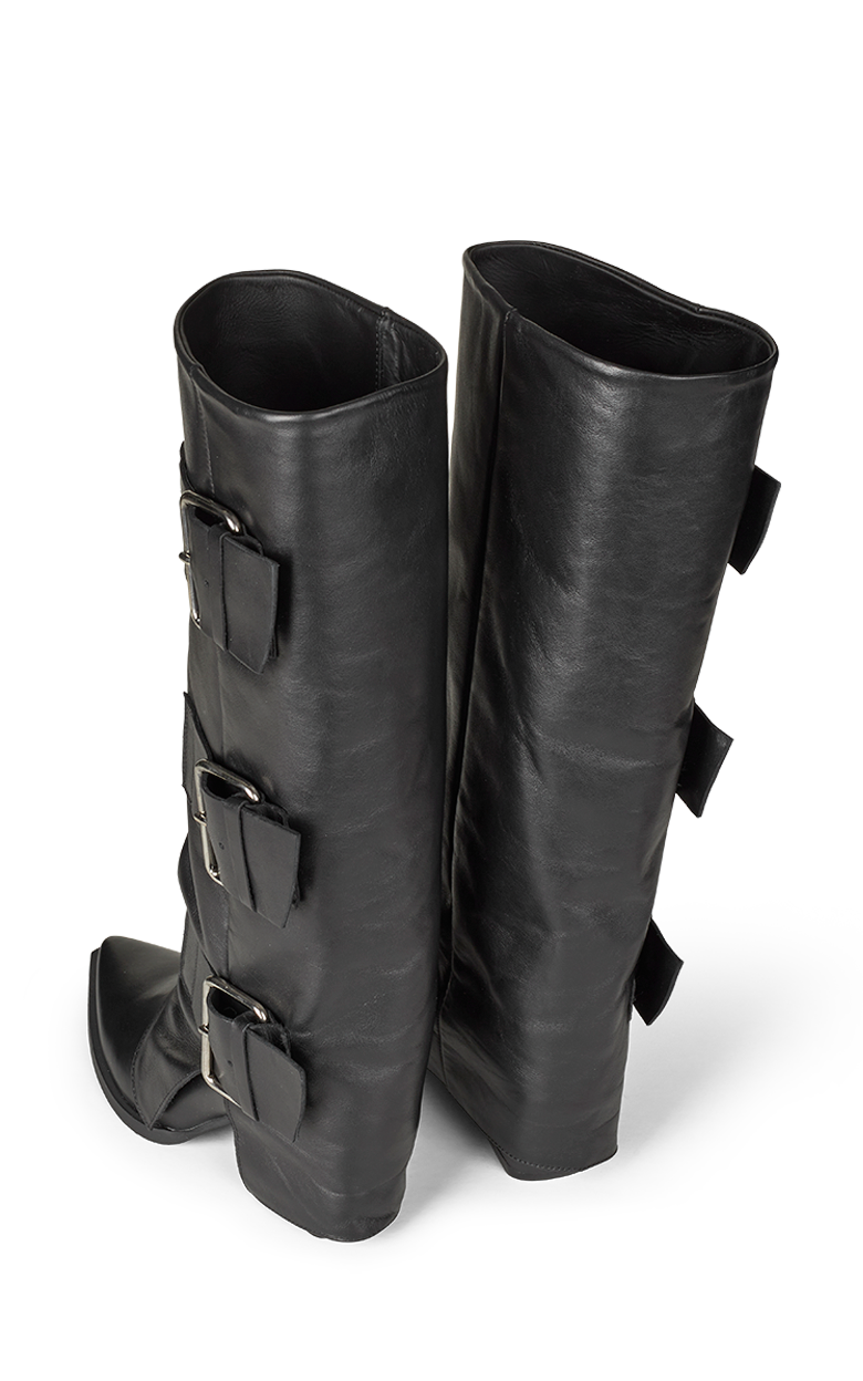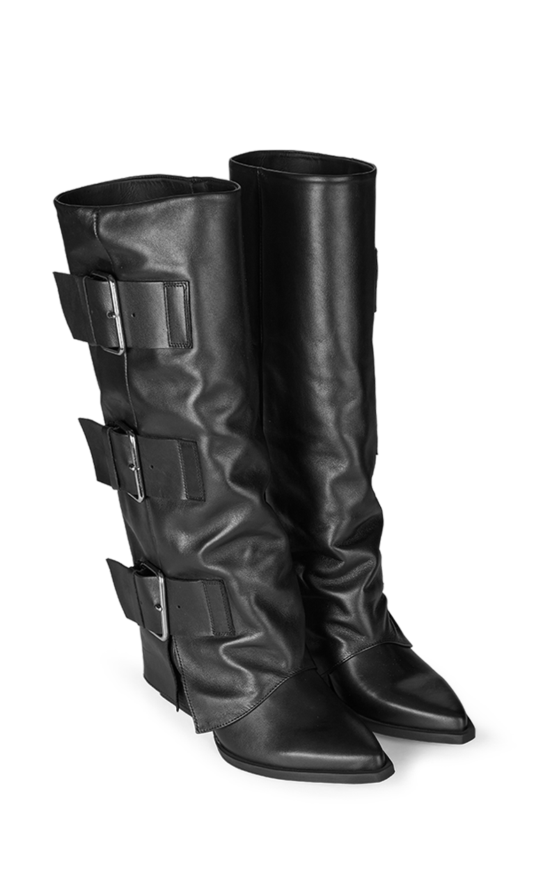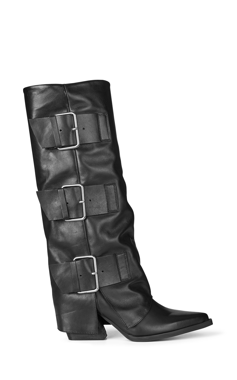 A long-shafted boot with a distinctive and raw design. Made of soft black calfskin, detailed with three wide straps and strong silver buckles, giving the boot an edgy and modern look. The stable block heel of approx. 5 cm makes the model comfortable to wear, while adding height and attitude.