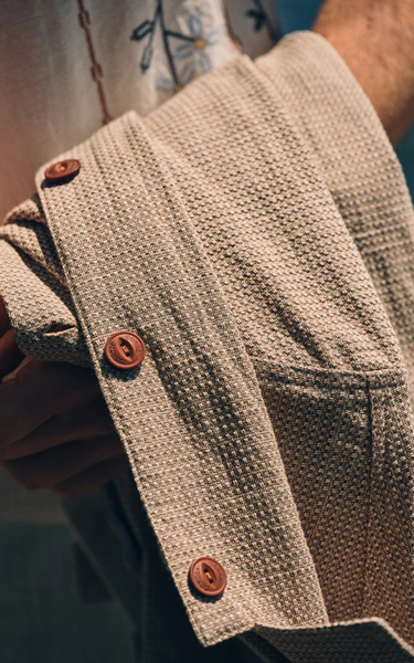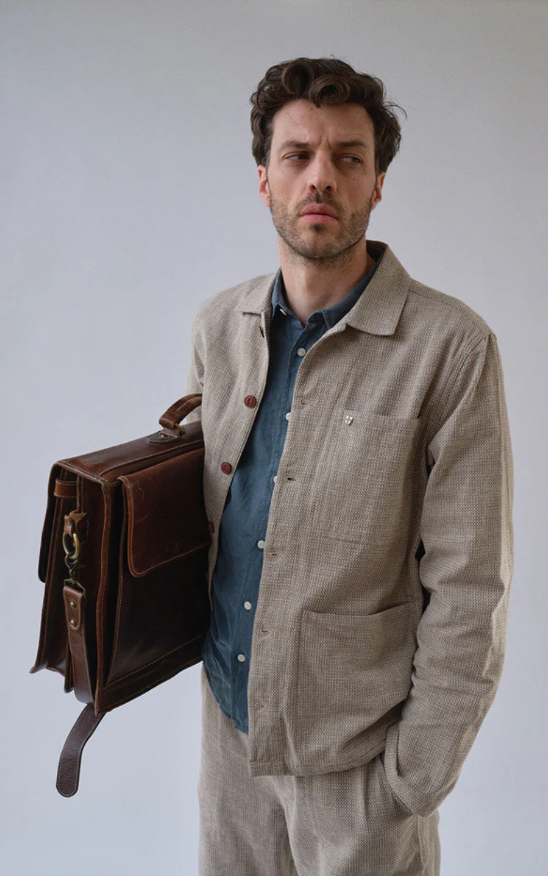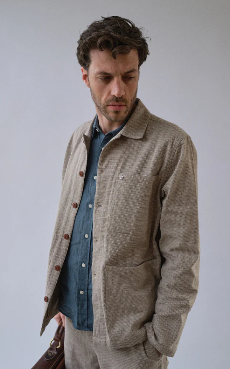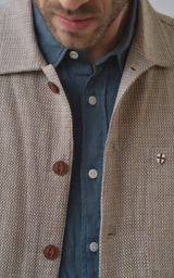The Jazzy Jacket is designed with a relaxed fit and a light, modern expression. The jacket features large patch front pockets and a hidden zip pocket, adding a functional element to the stylish design. The structured, lightweight cotton and linen blend offers an airy summer feel, making the jacket ideal for warmer days. Subtle details such as corozo logo buttons and a Blue de Gênes flag pin complete the exclusive look.