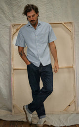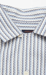 A regular fit resort shirt with short sleeves cut from a soft hand-woven cotton/tencel/linen blend. Featuring a yarn-dyed jacquard pattern and corozo logo buttons.