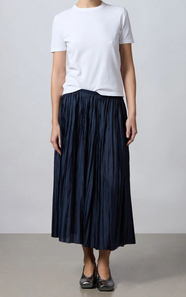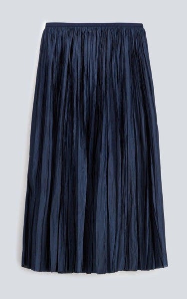 Pleated midi skirt with laser-cut edges for a seamless and elegant finish. The skirt is reversible, making it versatile and easy to style in multiple ways.
