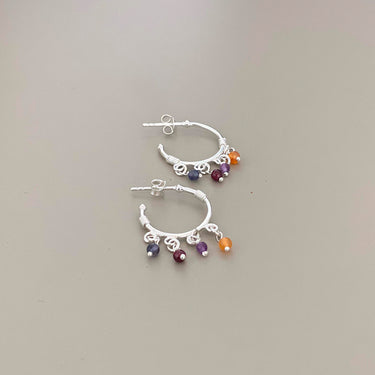 Colorful silver earrings with small pearls in different colors - attached along the hoop.