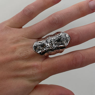 Sterling silver ring with pattern covers the finger beautifully.