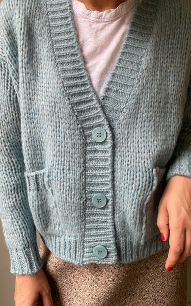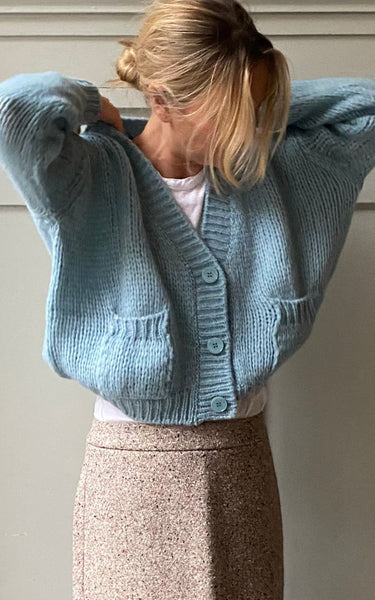 Lækker cardigan fra italienske Roberto Collina. V-hals udskæring, lommer og knappe lukning. Strikken er en smuk støvet blå farve.