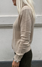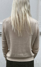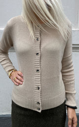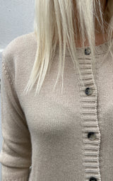 Beigefarvet 100% cashmere cardigan i klassisk design. Cardiganen har mørke knapper helt op foran.