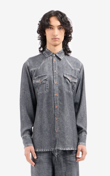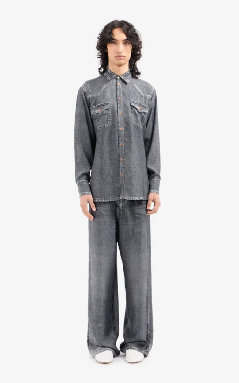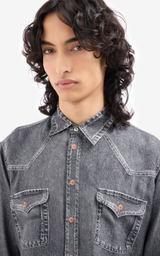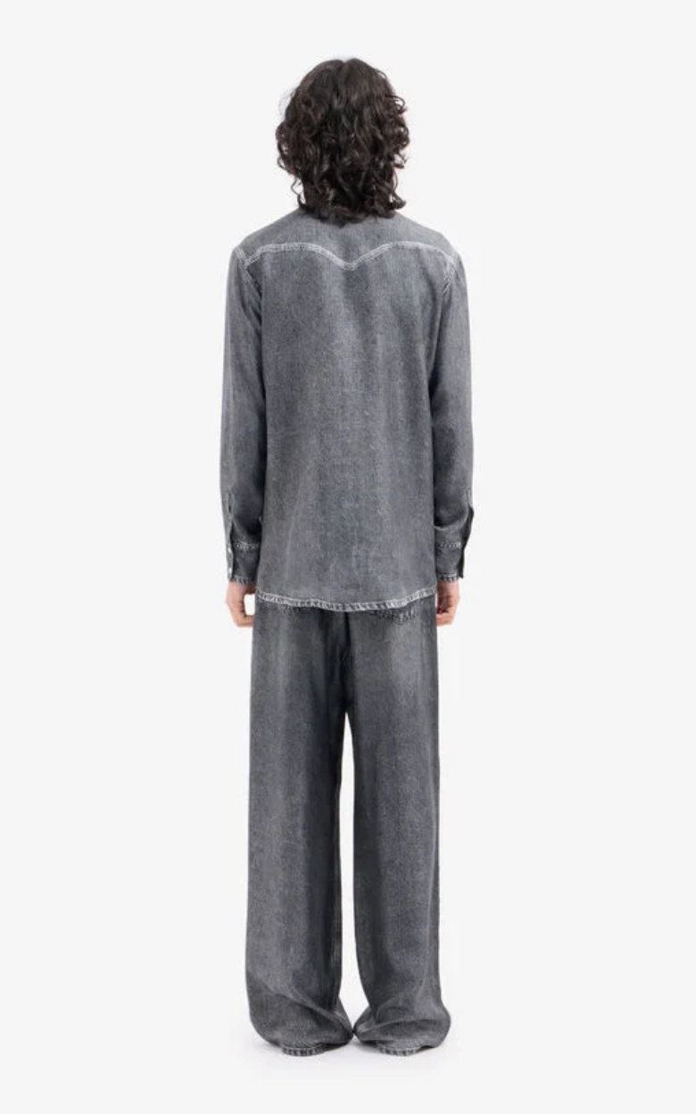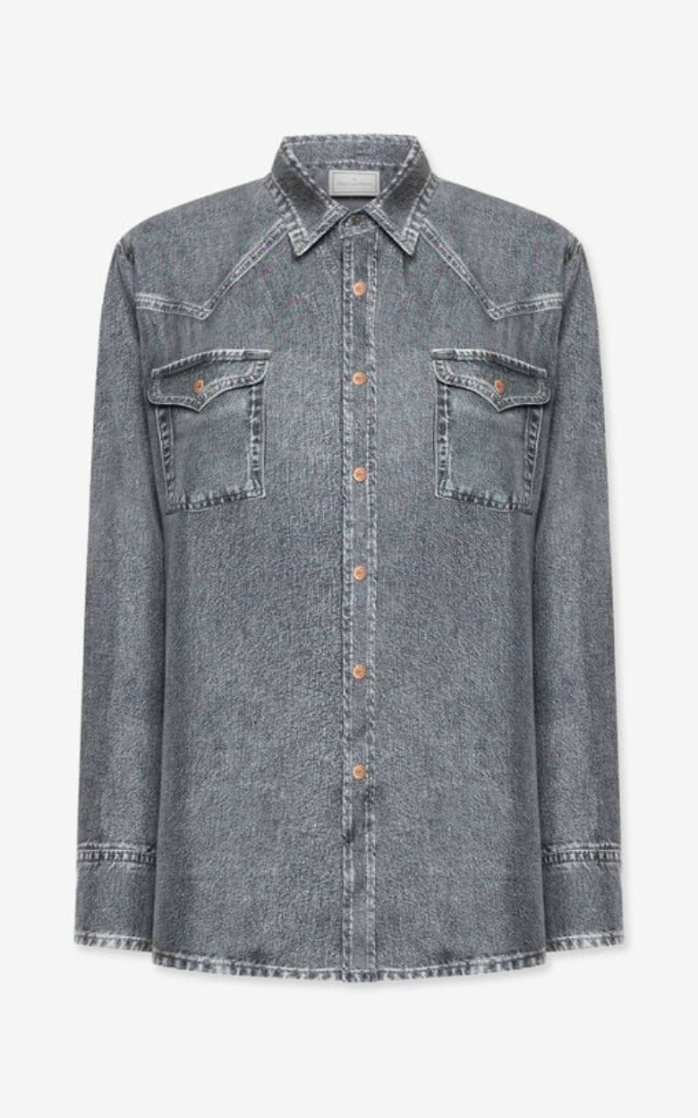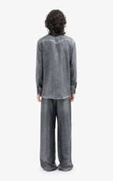 En silkeskjorte med lange ærmer, der forener denimlookets rå udtryk med silkens bløde, luksuriøse fornemmelse. Det trompe-l’œil-inspirerede denimdesign giver en elegant fortolkning af den klassiske westernskjorte med fine detaljer som klaplommer, kontrastsyninger og et skræddersyet udtryk. Let, alsidig og perfekt til at tilføre et uventet strejf af raffinement til et afslappet outfit.