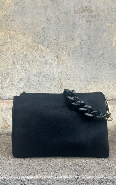 Super cool taske i brun og sort - tasken har sort ponyhår mixet med mørkebrune ruskinds "pletter" på forsiden, glat mørkbrunt skind på siderne og sort ponyhår på bagsiden. Tasken har en chunky kæde-rem i sort plastik, guld hardwear og er inddelt i trerum. Der medfølger en cross-body rem i sort skind.