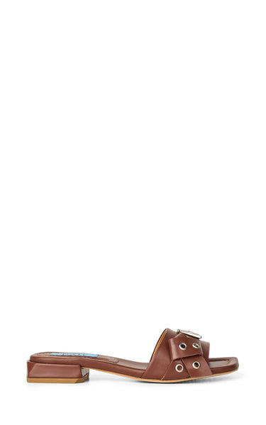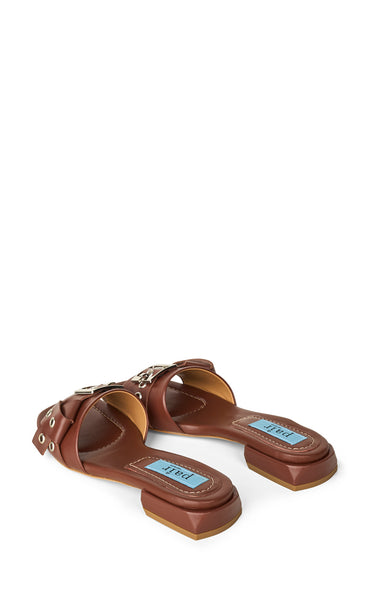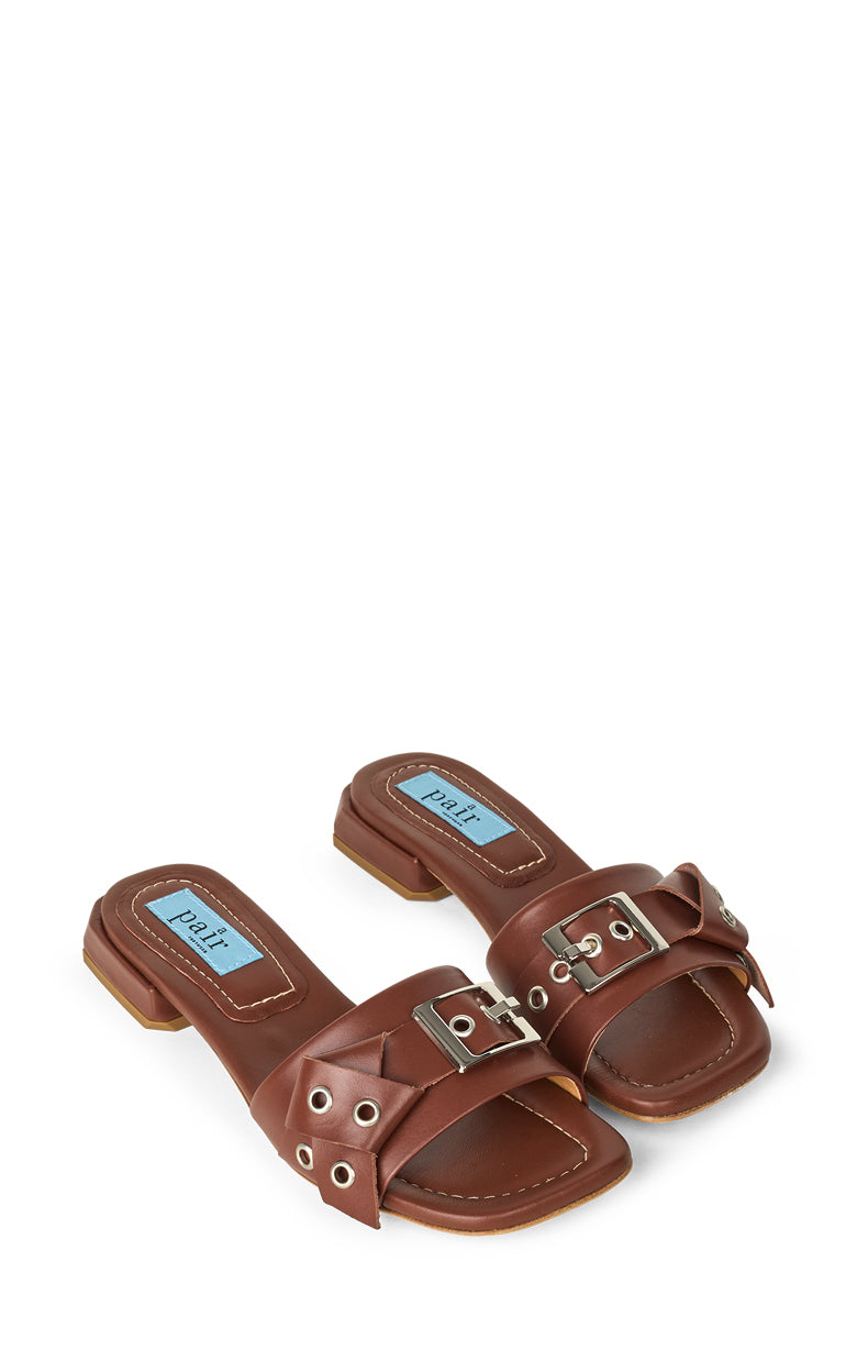 Statement sandal i blødt læder med et råt og moderne udtryk. De brede remme er dekoreret med markante spænder og metaldetaljer, som giver et cool twist til den klassiske slip-on silhuet.
