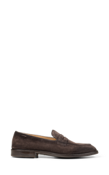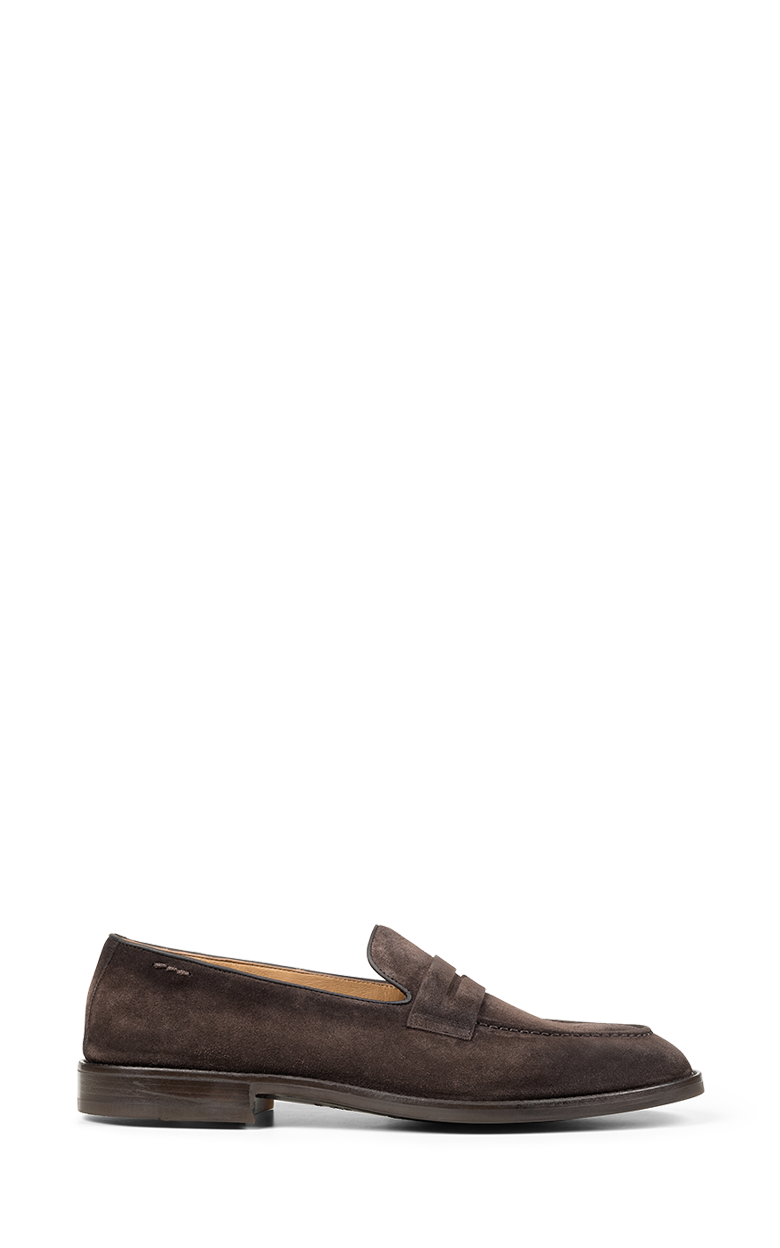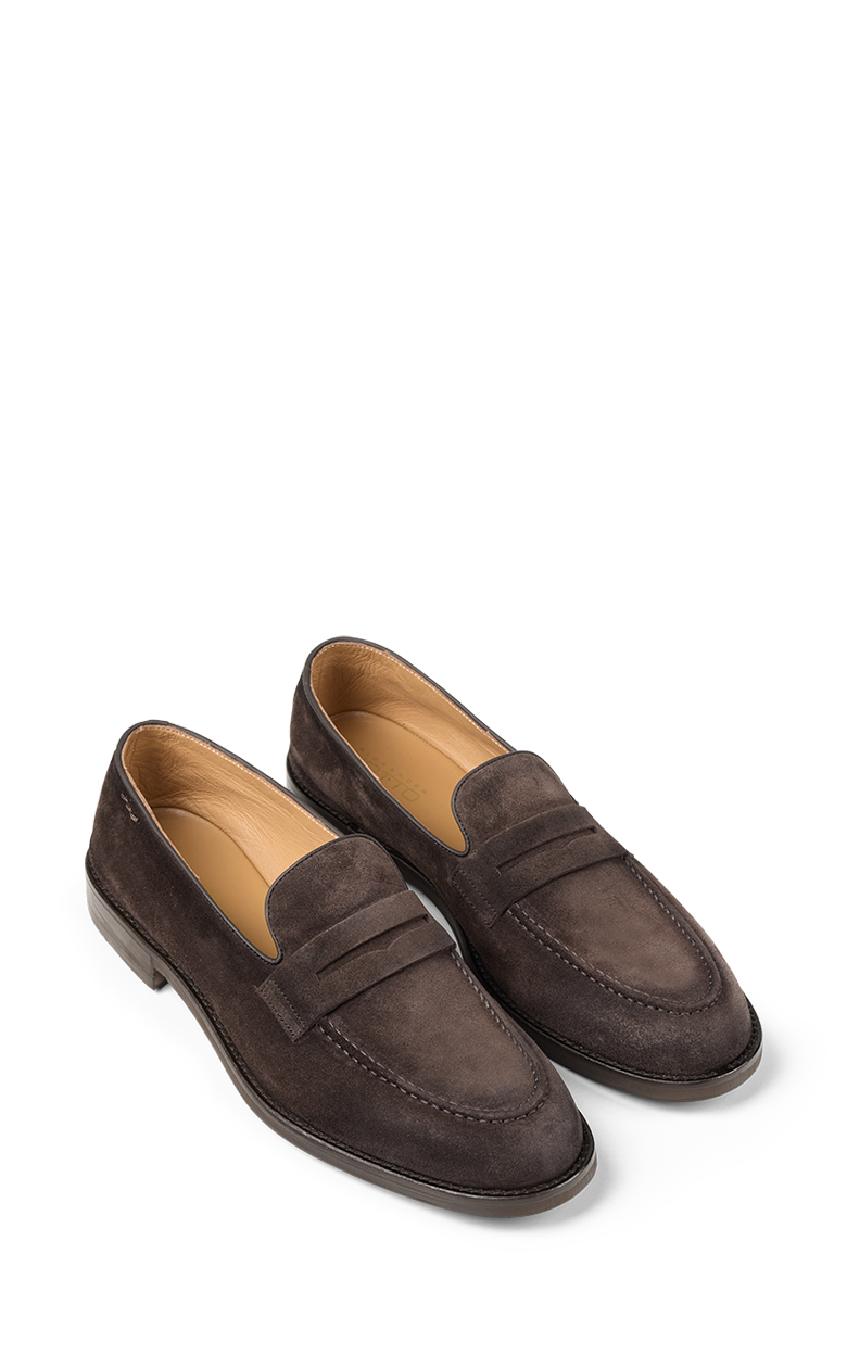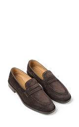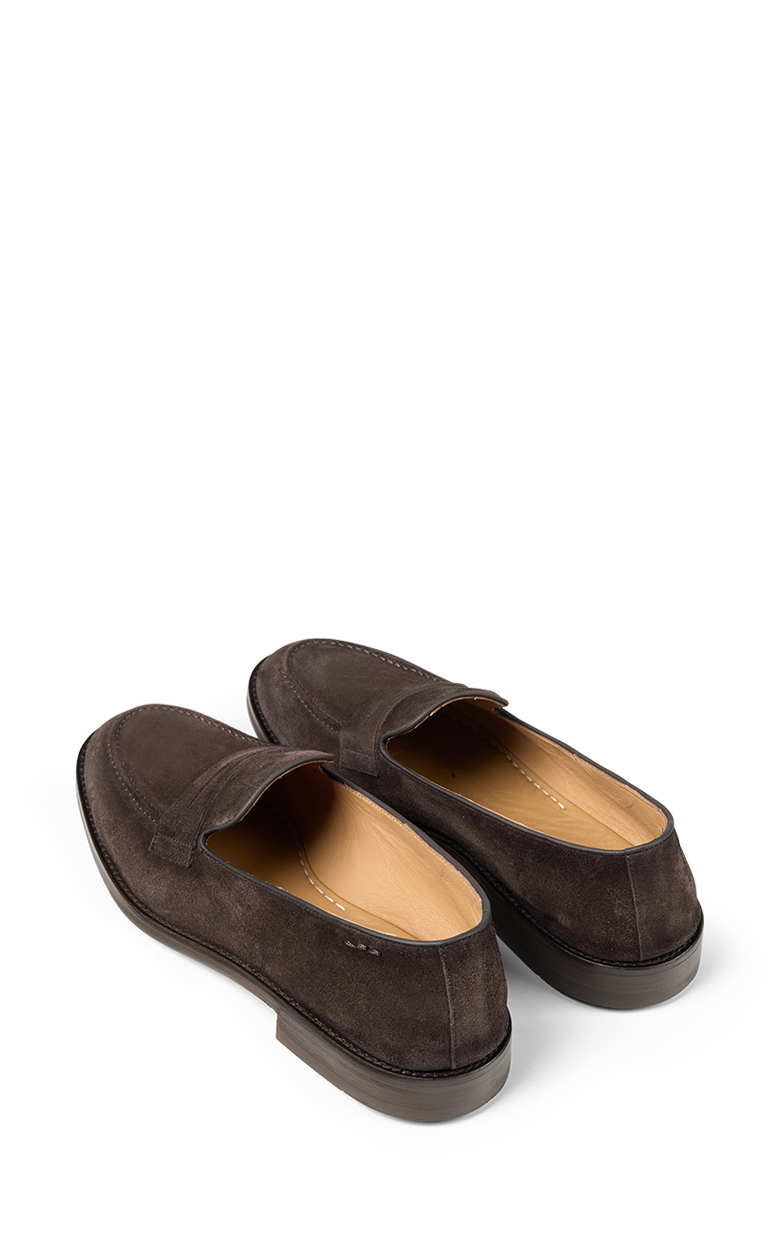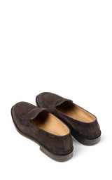 Herre loafers i mørkebrunt ruskind, ideelle til den, der ønsker en raffineret men alsidig stil. Den klassiske, minimalistiske silhuet gør dem perfekte til både elegante outfits og mere afslappede looks. Ruskindsoverdelen sikrer blødhed, åndbarhed og komfort, mens håndværket i Californien fremhæver skoens kvalitet. Den gummisålede bund giver stabilitet, fleksibilitet og godt greb på enhver overflade – en sko designet til at følge dig med stil hele dagen.