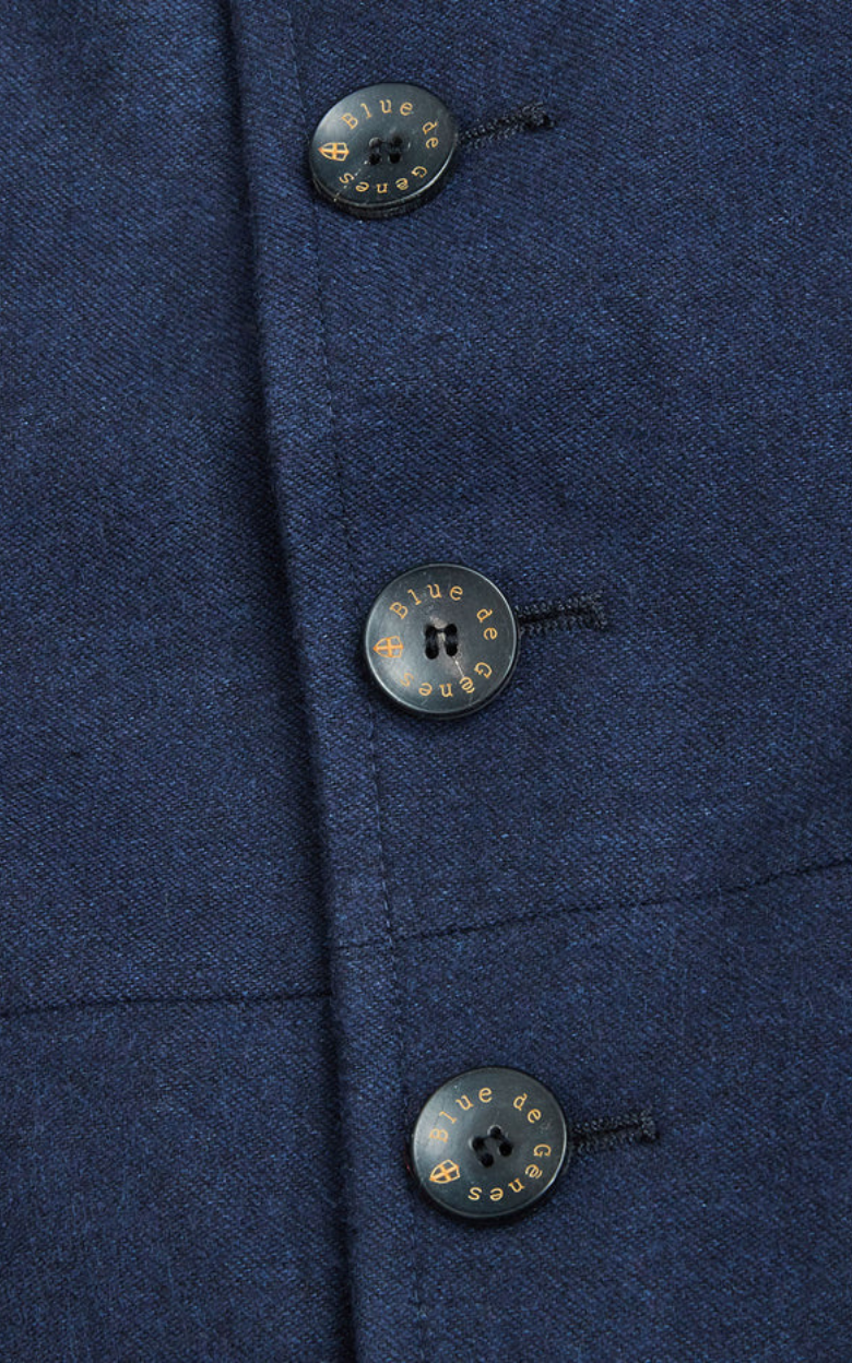 Blue de Gênes-flag-nitte ved brystlomme – signaturdetalje