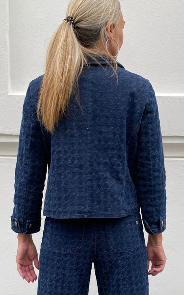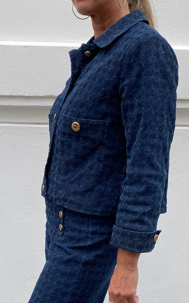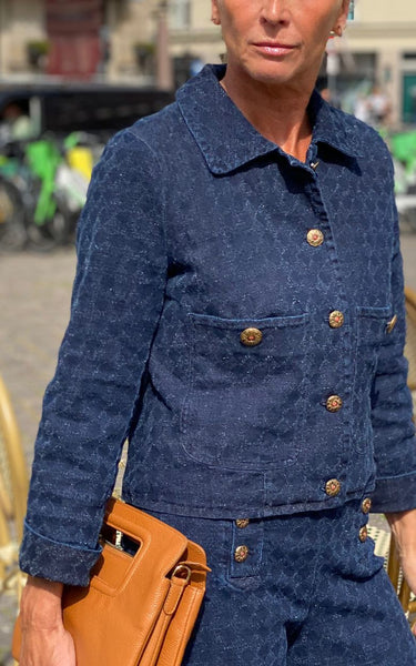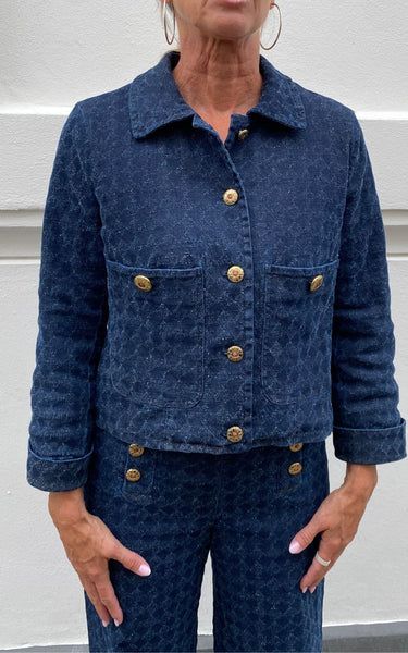 En elegant jakke i italiensk design fra Shaft. Jakken er skåret i et quiltet matelassé-stof i mørk navy og prydet med dekorative guldknapper, der giver et sofistikeret udtryk. De store frontlommer tilføjer både funktionalitet og et afslappet, men chic look.