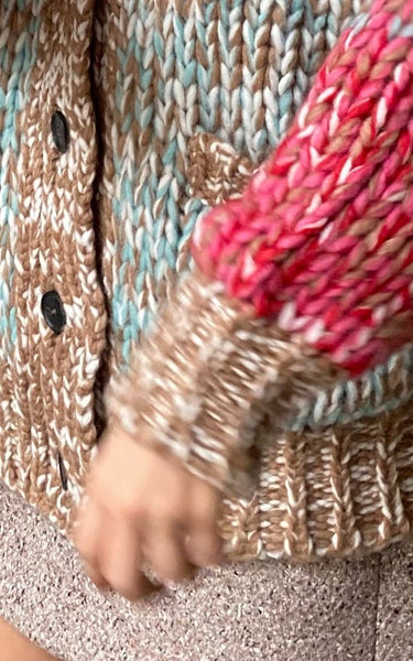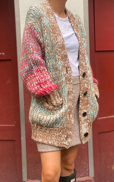 Cardiganen er en chunky strik med et brunt, hvidt og blågrønt farvemix. Den har lommer og knappe lukning. Cardiganen kan styles både åben og lukket. Den har v-udskæring og lange brede ærmer.