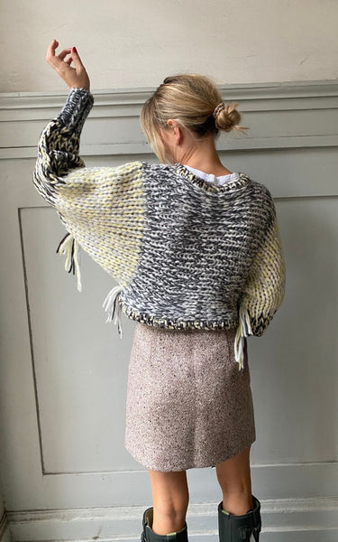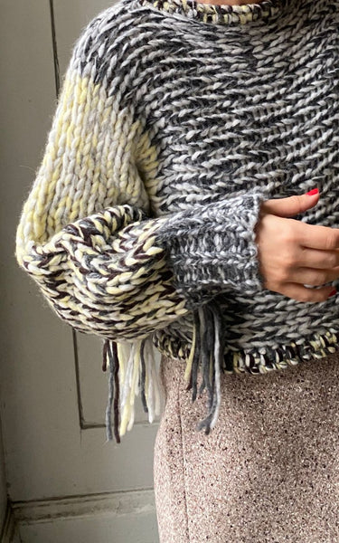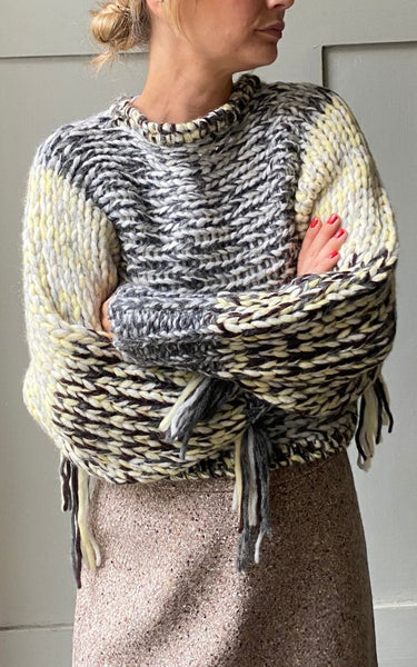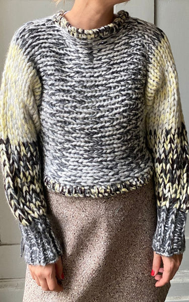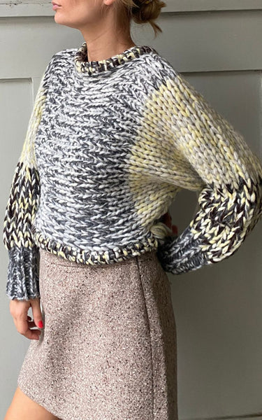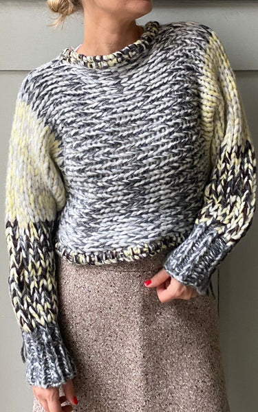 Kort cool strik med afslappet pasform lavet af blødt alpacagarn. Den er lavet specielt med en farveblok der giver mouliné-effekt. Den har en bådhalsudskæring, rene kanter på halsudskæringen og forneden. Der er ribkanter på manchetterne.