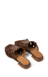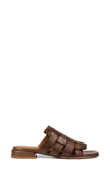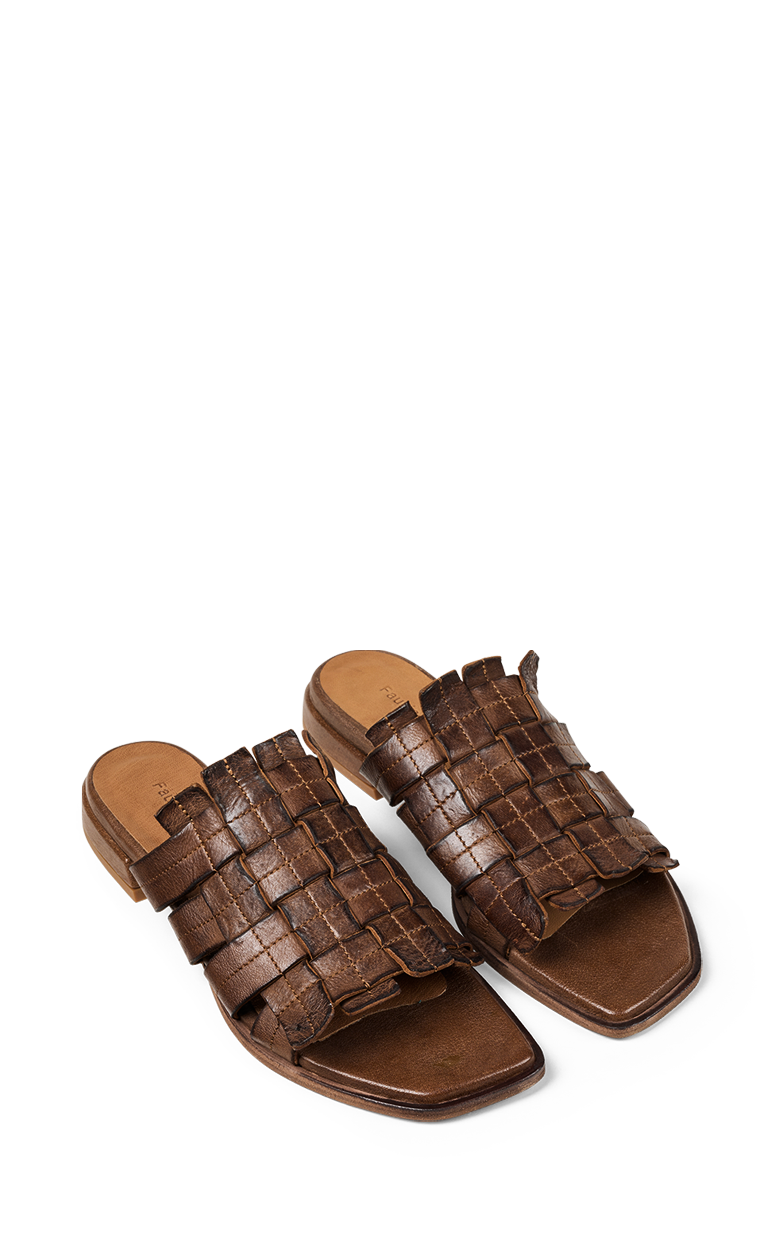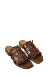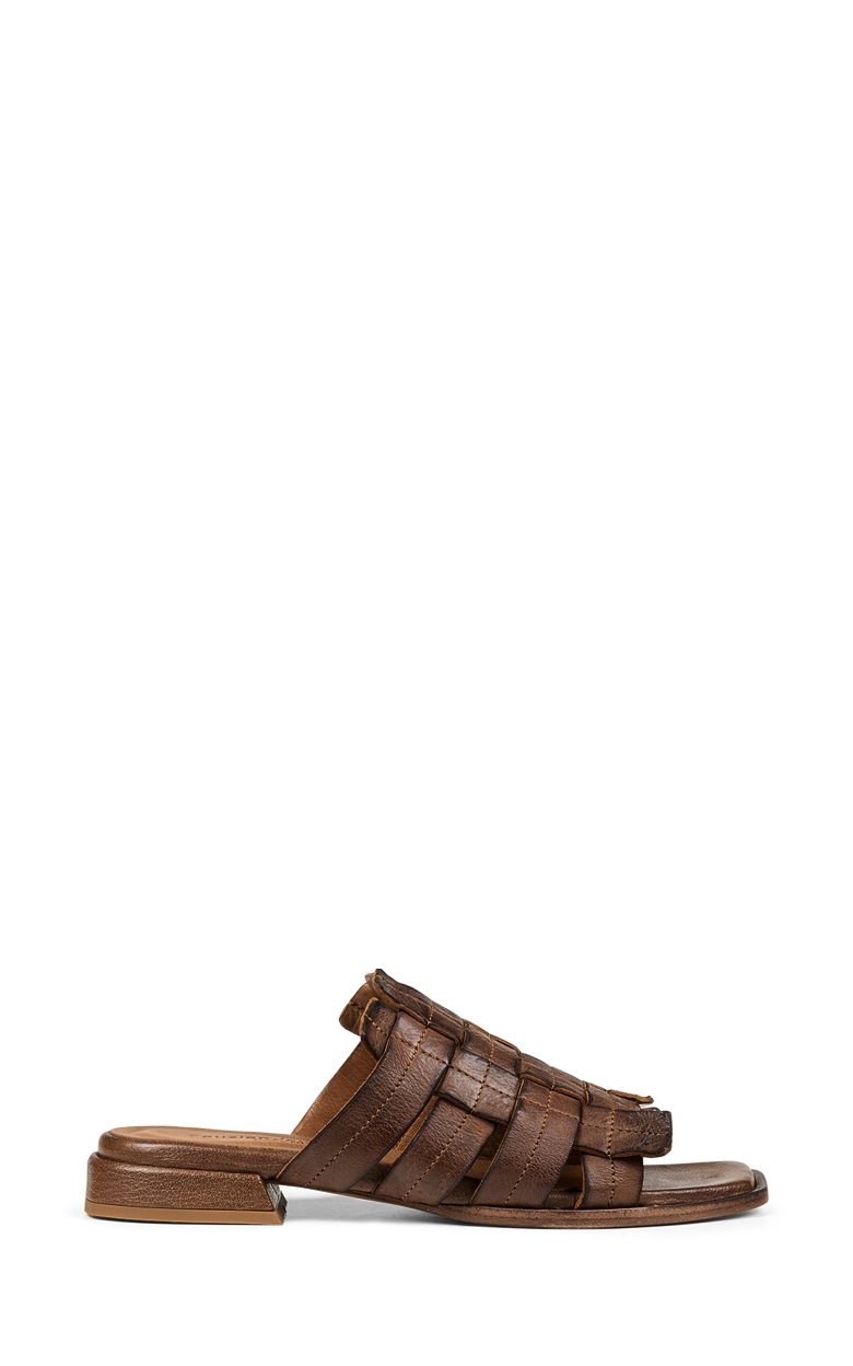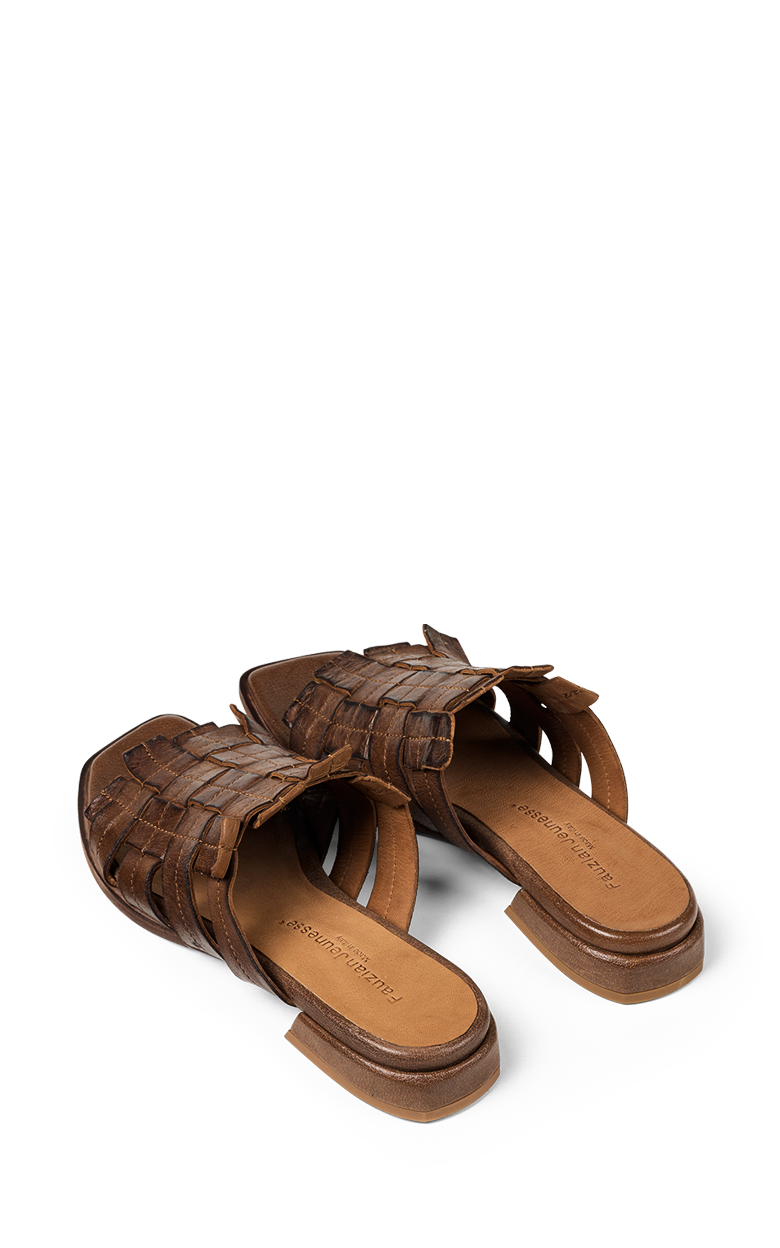 Håndflettet sandal i eksklusivt bøffellæder i en varm, naturlig “vecchio sughero”-farve. Sandalen er udført med håndværksmæssig præcision og har en lædersål samt en lav hæl beklædt med læder, hvilket giver et elegant og tidløst udtryk. Perfekt til sommerens hverdagslooks eller mere afslappede, elegante outfits.