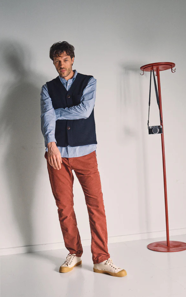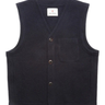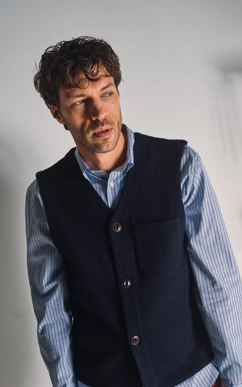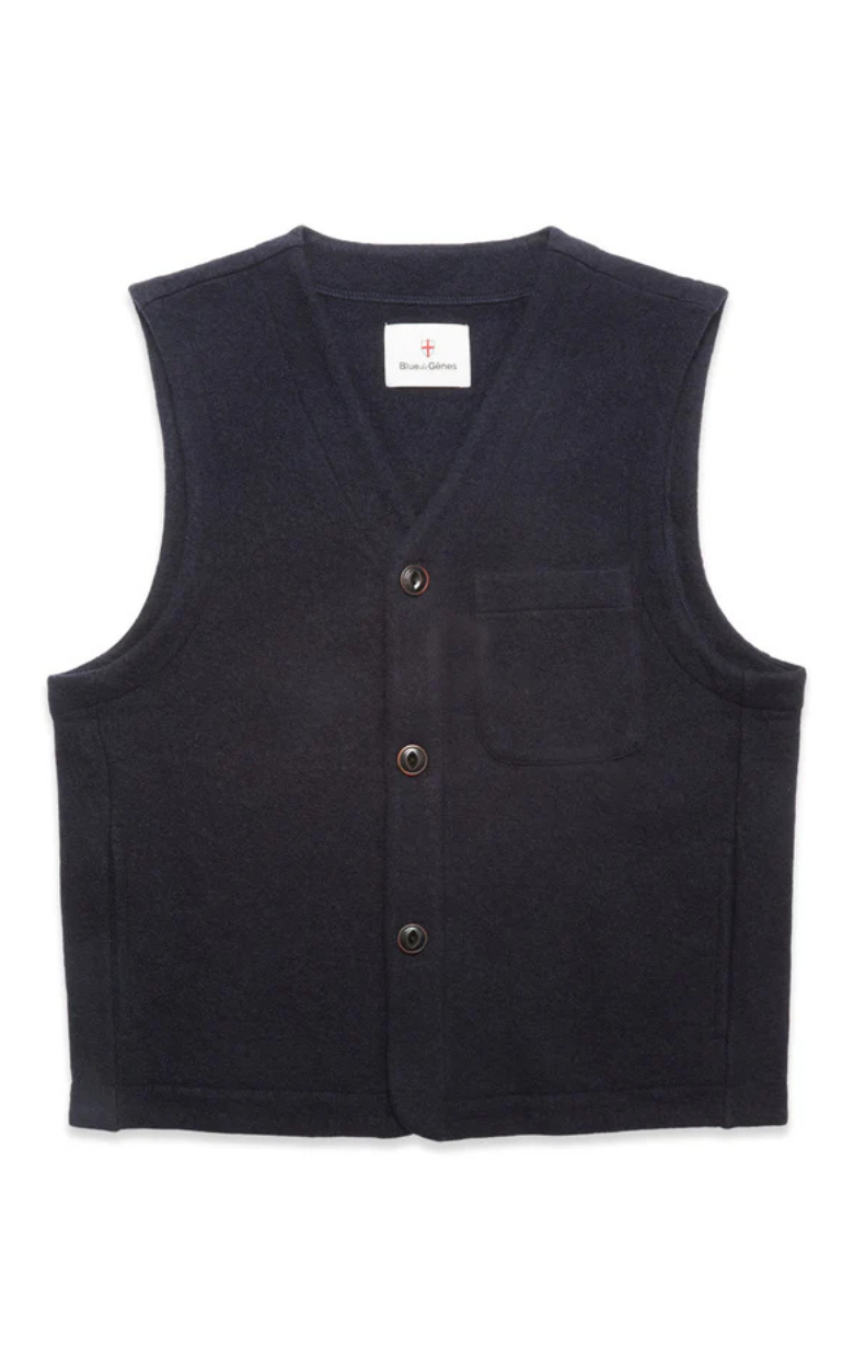 Koi Wool Gilet er et alsidigt lag-på-lag-item, der forener funktion og tradition. Designet i en regular fit kommer den med to påsyede forlommer, en praktisk brystlomme og brandede Corozo-knapper – en naturlig detalje, der understreger håndværket hos Blue de Gênes.