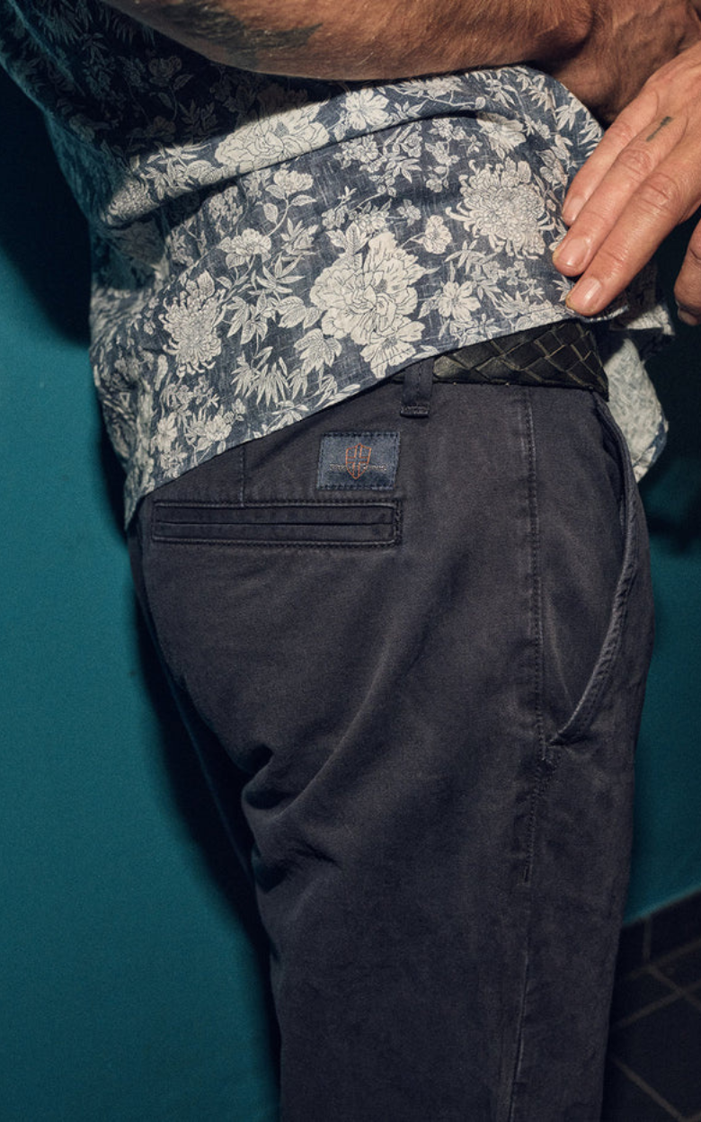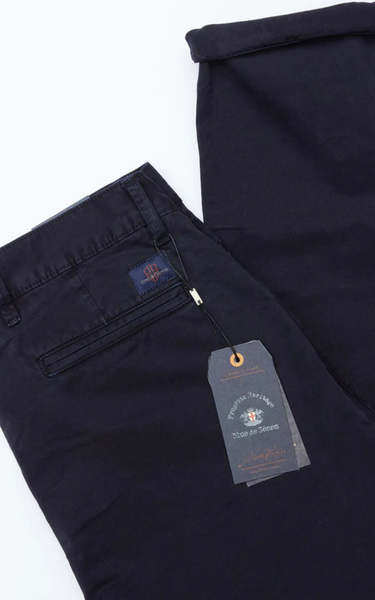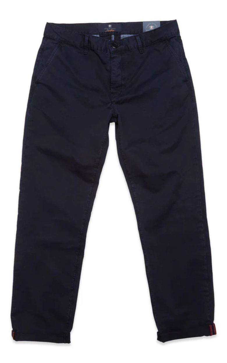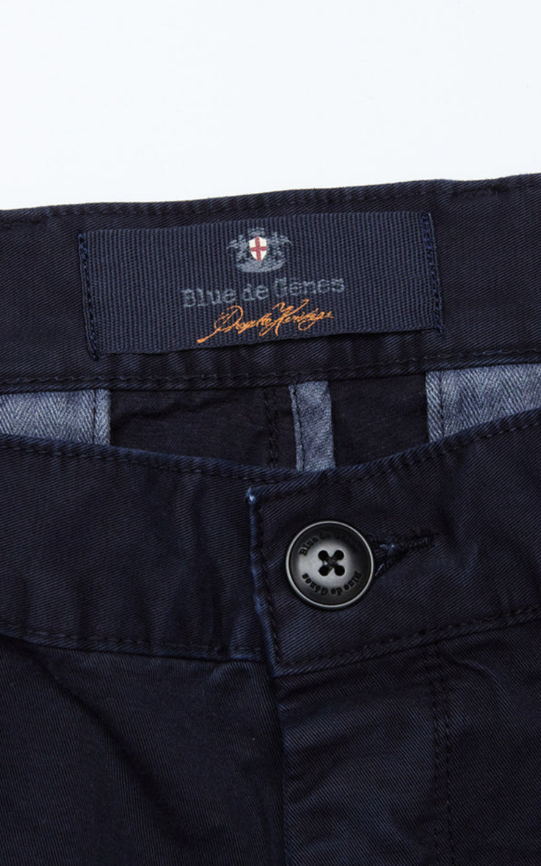 Franco Gênes Chino har en afslappet regular fit med lige ben og knapgylp. Bukserne er skåret i en robust Saia-twill 3/1 RH, garment-dyed for en blød og behagelig fornemmelse, og har en diskret Blue de Gênes-flag-nitte på venstre forlomme samt et subtilt logo-tryk på lommeforet.