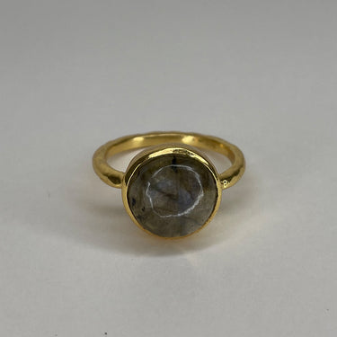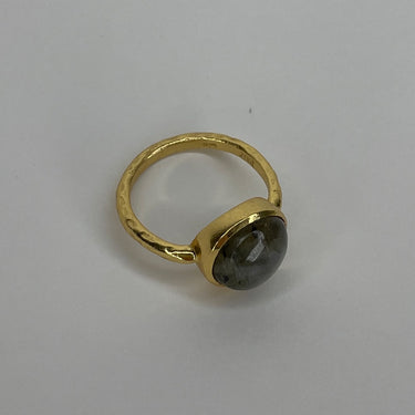 Smuk guldbelagt ring med en stor grå/blå labradorite sten. Stenens farve afhænger af lyset. Ringen har et enkelt og elegant udtryk.