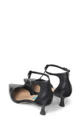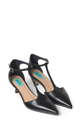 Smukke sorte stiletter med en kitten hæl, en rem fra den spidse forfod op til ankelremmen.
