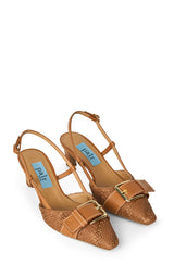 Elegant slingback i flettet materiale kombineret med glat læder for et eksklusivt og sommerligt udtryk. Den spidse snude og fine hæl giver et feminint look, mens den dekorative frontdetalje tilføjer et sofistikeret twist.