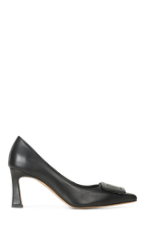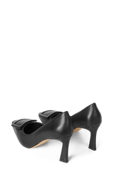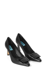 Vackra svarta stilettklackar med svart spänne framtill och spetsig tå. Spännet ger de annars klassiska stilettklackarna en cool twist.