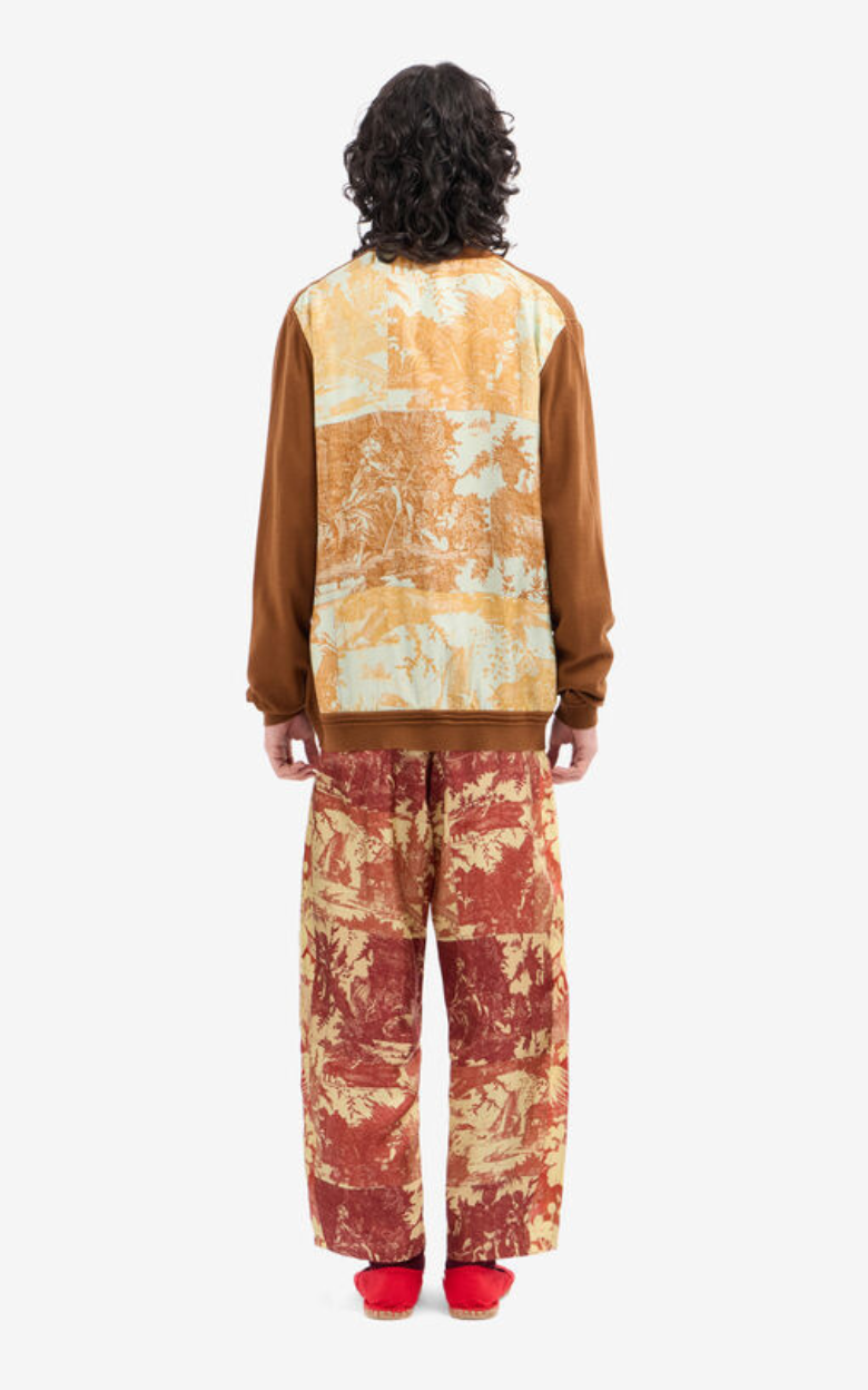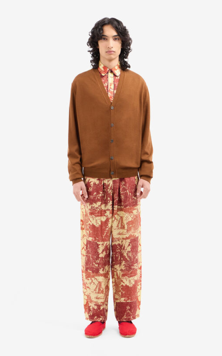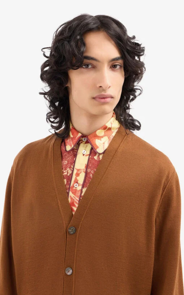 Cardigan i en elegant design med V-ringning, tillverkad i mjuk ull och i en djup brun nyans. Det konstnärliga landskapsmotivet på ryggen ger ett unikt och karaktärsfullt uttryck, som kombinerar vintageinspiration med modern stil. Den avslappnade passformen ger en bekväm och sofistikerad look. En mångsidig stil, som med fördel kan stylas över en klassisk vit skjorta för ett raffinerat uttryck.