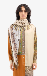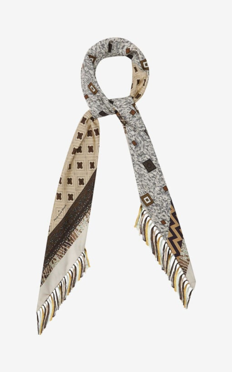 Sjal i en exklusiv design, tillverkat i mjuk silke och dekorerat med ett detaljerat geometriskt mönster i varma jordtoner, vilket skapar ett elegant och vintageinspirerat uttryck. De fina franskanterna tillför en lekfull och dekorativ touch. En mångsidig accessoar som kan stylas runt halsen eller draperas över axlarna för en sofistikerad look.