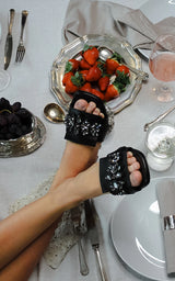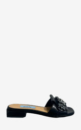 Vackra slip-in-sandaler i svart läder för kvinnor. Skorna har en enkel, diskret design med fyrkantig tå och en liten fyrkantig klack. Sandalen är dekorerad med ett kluster av mörkgråsvarta stenar. Sandalen har härliga mjuka innersulor och passar både för vardagliga och formella tillfällen.