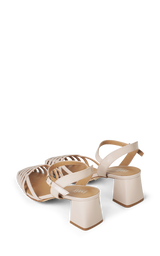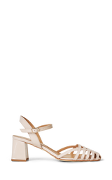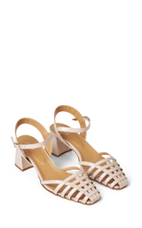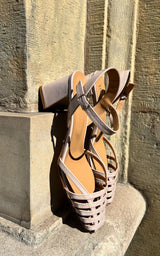 Ett par vackra lätta sandaler i lackat läder och grova blockklackar. Sandalerna har en justerbar ankelrem och är detaljerade med ett fint "rutnät" av läderremmar på tån. Härliga mjuka lädersulor.