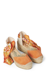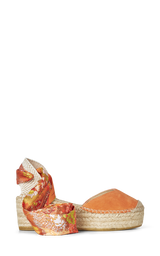 Vackra kilespadriller i vacker orange mocka. De har en 6 cm klack och det finaste bandet med blommor att knyta runt vristen. Handgjorda i 100 % naturliga och ekologiska material som juterep, vilket gör att Vidorreta-skorna anpassar sig efter fötterna.