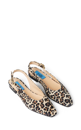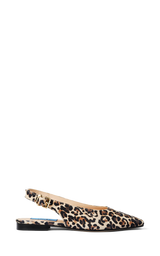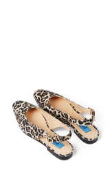 Fin ballerinainspirerad sko från Apair i mocka med leopardmönster och slingback. Den har en avsmalnande tå som blir fyrkantig och ett litet guldspänne som gör slingbacken justerbar.